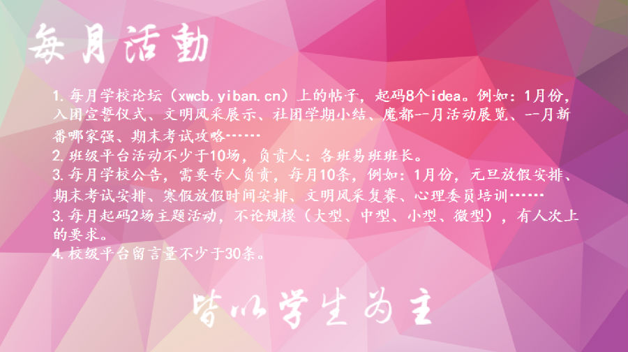活动分为线上和线下。每月都要有的线上活动,如发帖,公告。为什么要做这些?这些都是必须要做的,不然别的中职校怎么知道我们学校做了些什么,怎么与别的中职易班产生交流从而得到更好的提升呢?所以,10条帖子10条公告得发帖子从哪儿来?学校与易班挂钩的活动公告从哪儿来?关注学校各种通知,如期末考试安排表,各种活动时间安排等等。