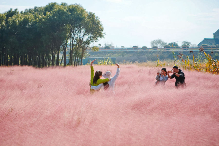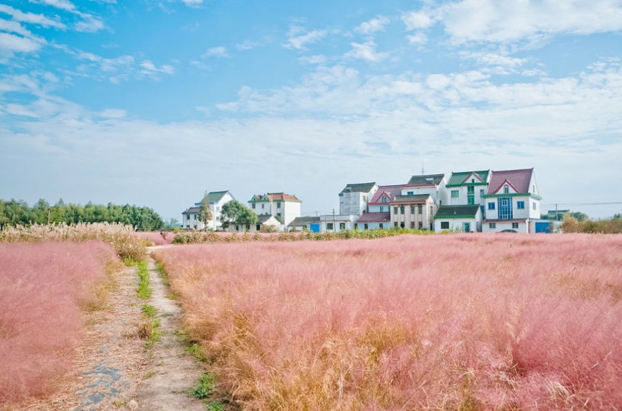 在金秋黄绿田野的包围和农舍白墙红瓦的映衬下,那一片“粉红海洋”仿佛是棉花糖一样轻盈曼妙,浪漫的氛围丝毫不输给薰衣草海洋。而这奇美的田园美景就在上海的金山郊野。