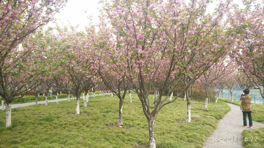 在绿色的枝丫、草坪的衬托下的一簇簇红色樱花,一棵棵樱花树,显示了春天的到来。