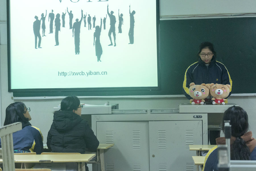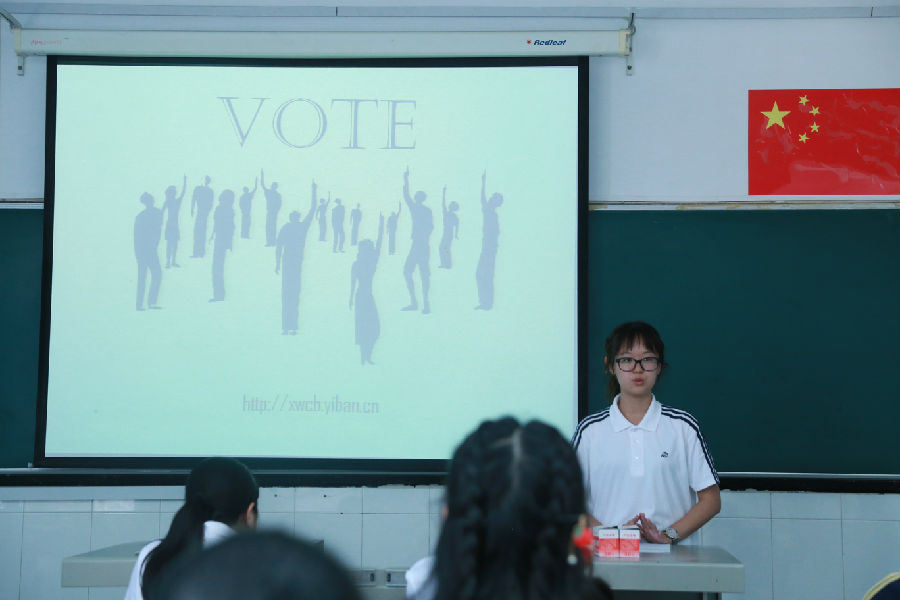 本次换届选举大会由三部分组成:参与竞选的候选人依次进行3分钟的演讲、虞琳老师上台发表重要讲话、各候选人退场。