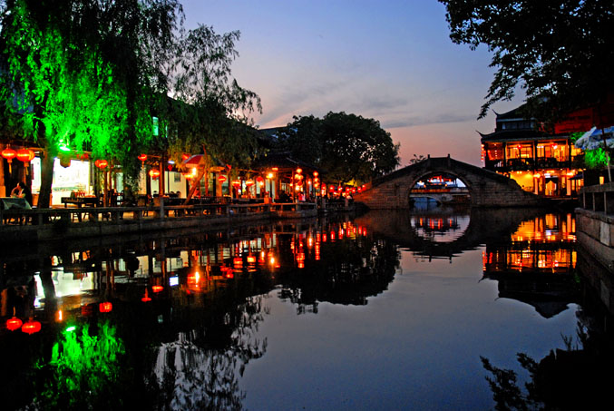 到了周庄,那还是下午,我们在岸边看见了两条乌篷船,于是我们决定划船兜一圈。天渐渐暗了,两岸的灯火通明,水中的倒影依然那么清晰。水面很静,静得像一面镜子。我们不愿打破它的宁静,于是就这样,看着,看着……