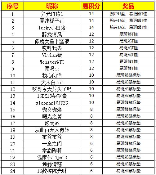 即日起至3月26日,凡参与本次版块联合活动,易积分排名前三即可获得腕带U盘,前十可获得易班熊T恤,更有50个易班熊鼠标垫随机附送。
