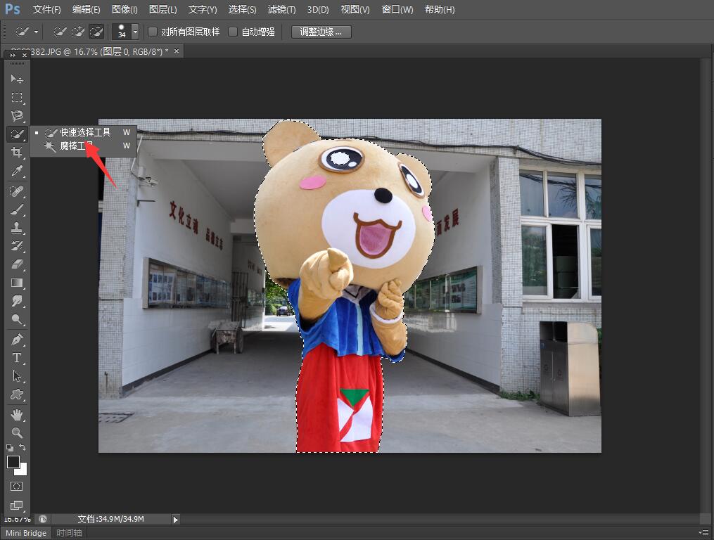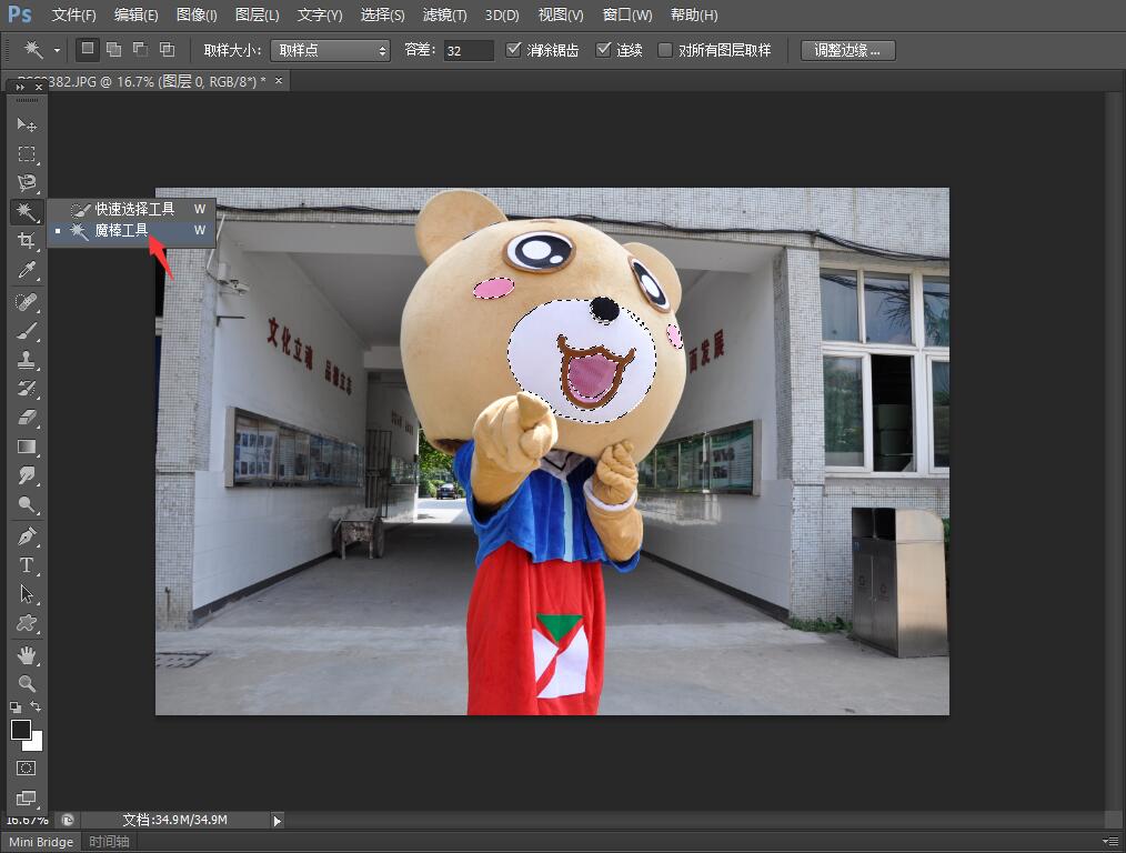 魔术棒是最直观、最简单的方法,适用于图像和背景色色差明显、图像边界清晰的地方。使用方法很简单,选择魔术棒工具,根据我们的需求修改容差,点击我们需要的部分,就可以选择我们想要的部分了。