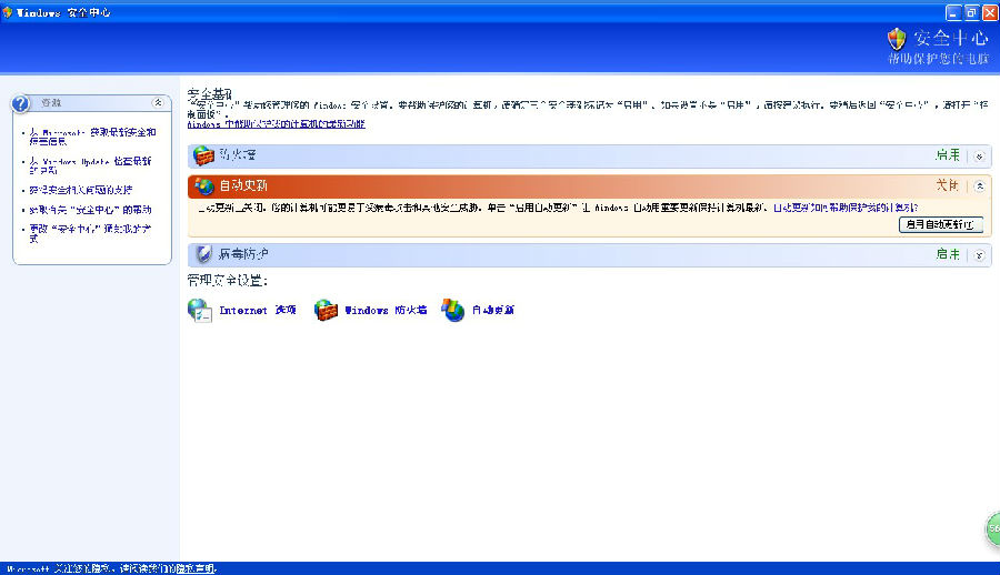 3.返回控制面板,单击“安全中心”,确认自动更新是否启用,确认启用后确定退出