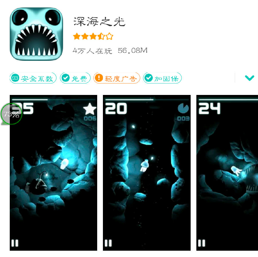 在游戏中你会扮演一只小水母,为了维持在幽深黑暗的水世界中光亮而斗争。在探索的过程中,你会遇到许多隐藏于黑暗之中的生物张开大嘴准备将你一口吞下。轻灵的游戏音乐也会让你身临其境,似乎是自己遨游于深海中。