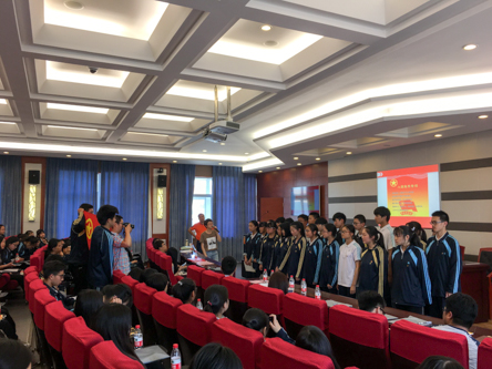 稍作休息,会议正式开始。共9位候选人依次上台进行1分钟就职承诺,候选人的发言让台下的代表感受到他们的热诚。统计选票期间,大会筹备组特别安排了三个节目,希望能通过节目缓和会议中紧张的气氛,使代表们放松身心。率先出场的两名同学带来一段朗诵——《与你同行——庆祝建团95周年》,两位同学声情并茂的演出吸引了不少代表的目光,博得极大地好评。随后又有男女声合唱,一曲校歌,即使有没专业歌手的完美却也唱出了青春的气息。共青团团歌响起,两列中队整齐有序的进入了会场,在校团委书记吴玥尔同志的带领下,新团员们对着团旗庄严宣誓。在场的所有代表见证了又一批新血液融入了中国共青团这个大家庭,深感荣幸。