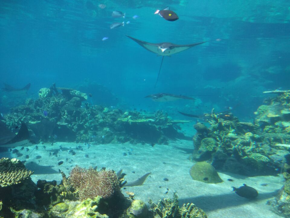小编接下来到的是鲨鱼馆,这里有我最喜欢的一个板块——水下观景台,它是鲨鱼水池下方的视角。这里充斥着各种各样的鱼类,有鲨鱼,魔鬼鱼,甚至还有小型的热带鱼。让我感到新奇的是这些鱼无论大小都被放到一个池里,却都和睦地生活在一起。