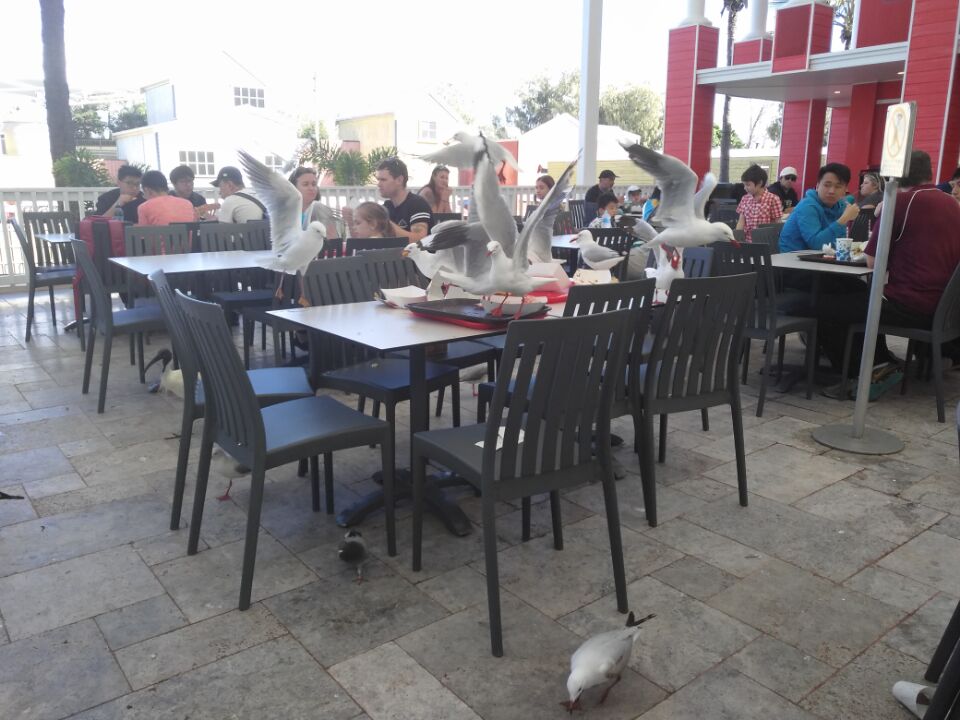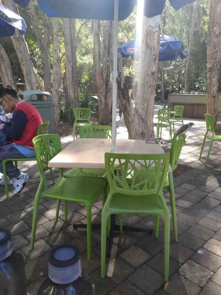 小编是10点半到的,所以和小伙伴在一旁的休息区等待15分钟后的剪羊毛表演。几只调皮的鸟儿似乎闻到我们的食物,围绕在我们周围,有的还俯冲而下,立在我们身旁的椅背上,下了小编一大跳。