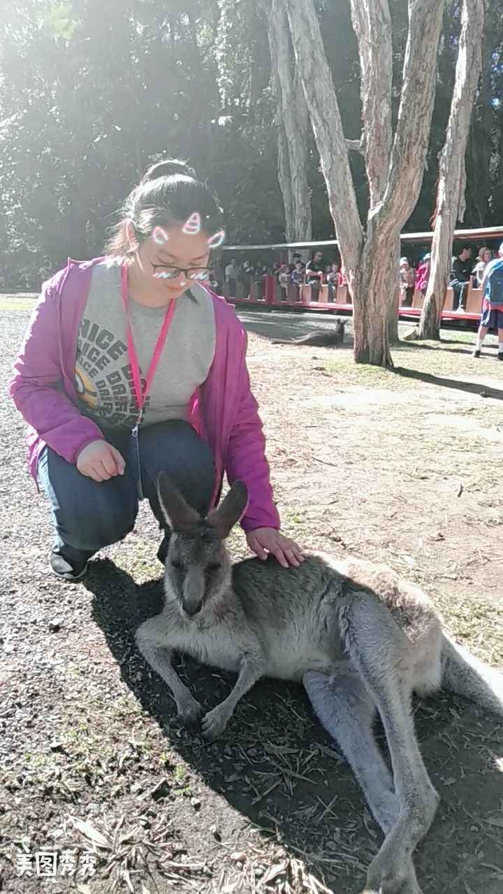 大部分袋鼠都趴在地上懒洋洋地晒太阳。我一直围着一只袋鼠,摸它柔软的皮毛。它似乎被我骚扰烦了,转过头站起身,高冷地蹦到围墙边缘处。(´`)