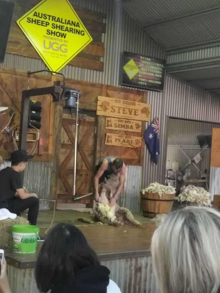 主持人先叫了三名观众上台做志愿者。他用熟稔的手法用电子的剃毛机为羊剪毛。两条腿夹住羊身,从羊的肚子开始,向四周剃,羊也懒懒的躺着,很舒服的样子。在示范后还,还让志愿者尝试,上台的有一位中国女士,主持人突然声音柔声细语,还用中文说你好,浮夸的动作让小编和台下观众开怀大笑。