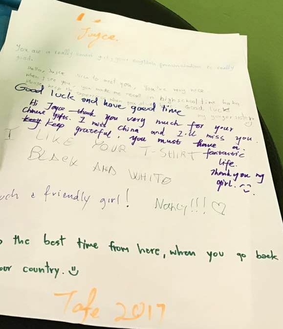 小编在普通班一共度过了四天的美好时光,为了给普通英语班画上一个圆满的句号,老师还为我们准备了欢送仪式,他给了我们每人一张纸并要求写上自己的名字和Tafe2017。随后,老师让我们将纸夹到背后并面相墙壁。随着其他人陆续上前,疑惑也随之解开,原来是让其他人在我们背后的纸上匿名留言。拿下纸条,看到满满一张纸的祝福,我和小伙伴对视了一下都种鼻子一酸的感觉。