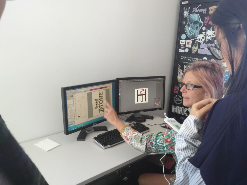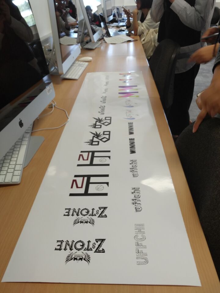 在上专业英语的同时小编就开始平面设计的课程了。我们的任务是设计一个属于自己的logo。小编在自己的手稿和网上的字体各选择了一个作为主体,并通过颜色,大小等方面的调整进行完善,最后通过老师的帮助将电子稿变成我们手中的贴纸。老师带着小编绘制,调整,打印,使小编清楚地了解了制作贴纸的过程,让小编见识到许多平常了解不到的东西。