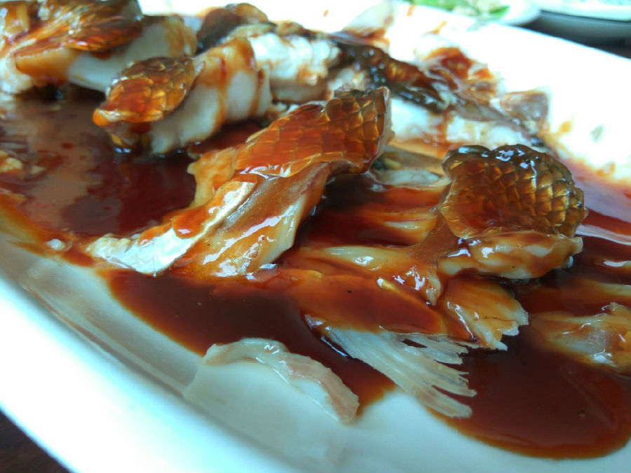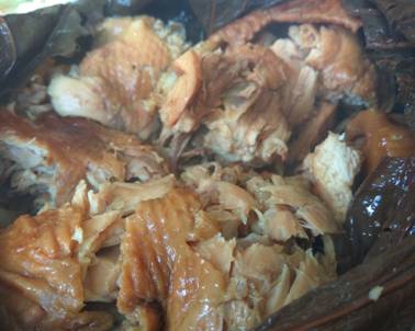 烤的酥脆,微微一扯肉与骨立刻分开,伴随着鸡肉入口,齿间弥漫着芬芳的泥土和荷叶的香味。