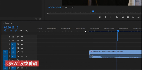 二、快速波纹剪辑:Q&W,以前有不少同学会使用Ctrl+K来切割素材,然后使用D选中素材并删除。这个处理非常麻烦,其实按下Q&W,就可以使用波纹剪辑功能,自动剪辑素材并且与之前的素材相连。
