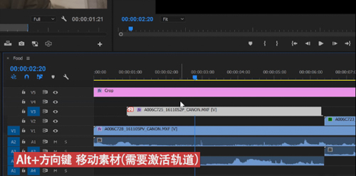 、移动剪辑:Alt+方向键:通常我们都需要鼠标移动剪辑,但是当你按下D选中对应素材以后,其实你可以按住Alt和上下左右键移动素材的位置。需要注意的是需要激活相应的轨道才能够进行移动。如果你想要快速移动素材,那可以按住Alt+Shift+方向键来快速移动素材。