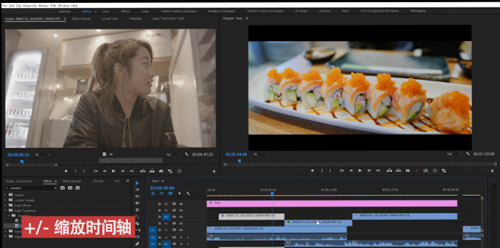 、时间轴的缩小与放大:\反斜杠,通常我们使用+/-号缩放时间轴,但是你也可以使用反斜杠来进行快速缩放,只需按一下你就可以缩放到整个序列的长度。然后再按一下就可以回到原来的状态。相对效率会比加减号高很多。