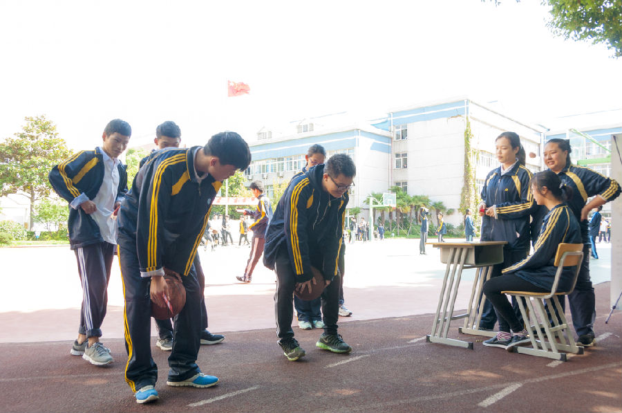 趣味篮球点上的同学人也不少,同学双腿夹球跳跃向前,摇摇摆摆的动作不由引起大家一起哈哈大笑。