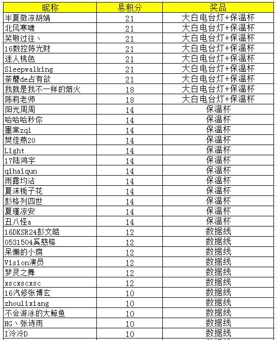 即日起至12月4日,在论坛中举办8个版块联合活动,本次版块联合活动易积分排名前三的同学可获得提供的大白电台灯一个,前十可获得易班保温杯更有20个易班数据线、鼠标垫随机附送礼品多多快来参与吧~!