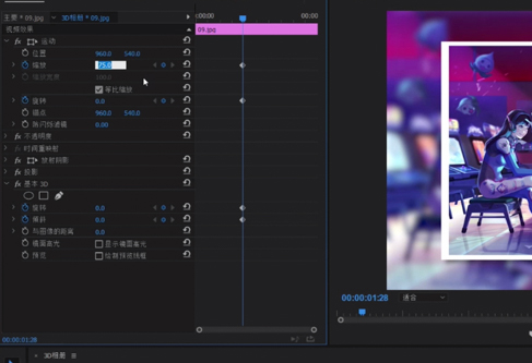 接下来我们进行最后一步,给素材添加3d效果,在效果面板里找到基本3d,拖入素材,然后我们把缩放、旋转以及倾斜打上关键帧。