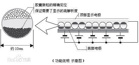 Eink所显示的图文是由覆盖在表面无数的微胶囊形成的,在胶囊内装有两种极性不同的超微粒子,一般分别为带负电的黑色粒子与带正电的白色粒子(这也导致了绝大多数电子墨水屏幕只能显示黑白图像)。在电路工作时,胶囊内的不同颜色的粒子会因为所施加的电场不同,粒子朝着不同的方向进行运动,就形成了电子墨水屏幕上的图文样式,而且随着不同的电场强度,图文的深浅、灰度也会发生不同的变化。而这也造就了电子墨水屏幕极其省电的特点,因为屏幕只有在刷新时才需要进行通电,而刷新完后图文信息将一直保留在屏幕上,就像是“印刷”上去的一样。而且构成电子墨水屏的电路十分轻薄,理论上可以使用在任何物体表面,目前成功实用化的有索尼的电子墨水手表,通过app控制,覆盖在手表上的柔性电子墨水电路会做出反应,打造出风格千变万化的表带以及表盘。而且随着研发技术的不断提高,电子屏的精细程度越来越高,目前世面上主流的墨水屏的进度为300ppi,精细度直逼激光印刷。