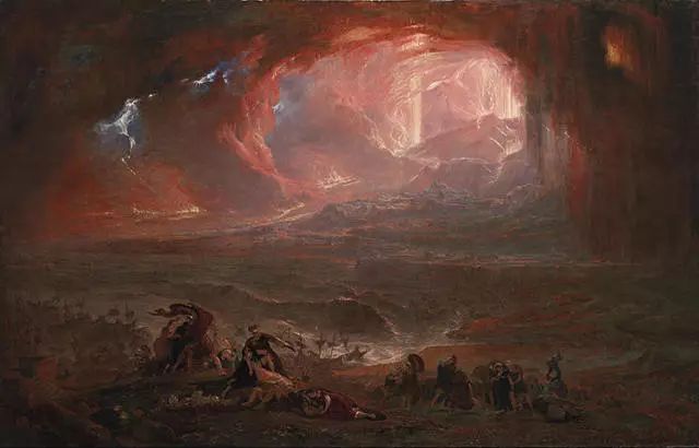 是约翰·马丁,1822年所绘,2011年修复。此画讲述的是:公元79年,位于那不勒斯海湾东海岸的维苏威火山爆发,导致赫库兰尼姆(画面左侧被熔岩覆盖之处)和庞贝古城(画面右侧仔细描绘指出)均被摧毁。火山喷发出的熔岩将此时充斥着闪电和滚滚烟尘的天空照的通亮,前景中吓坏了的人们正在往陆地上逃离。马丁曾在伦敦的埃及馆展出过许多大型作品,其中也包括这幅油画。马丁的那些以圣地和其他文学作品为题材创作的画作,在当时取得了巨大的成功。