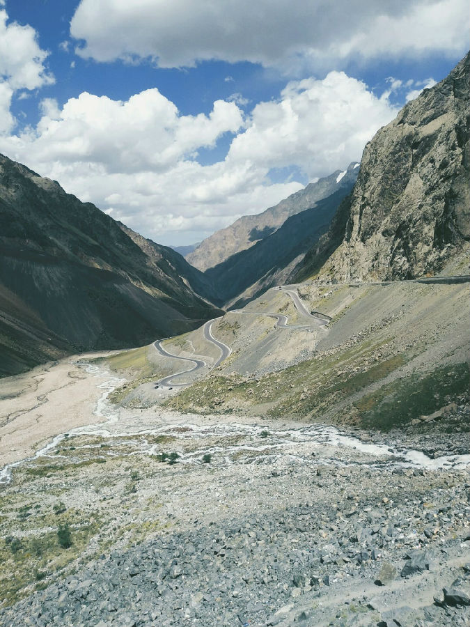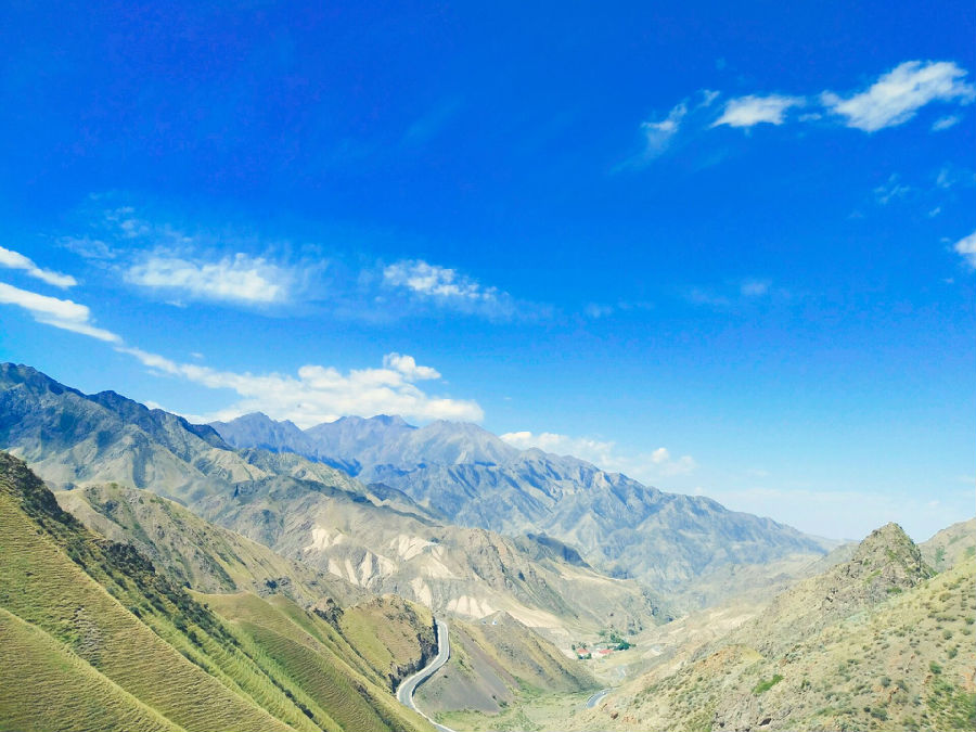 独库公路,顾名思义,就是一条连接独山子和库车的公路。驱车一路颠簸,一边向远方望去:曲折的路蜿蜒着伸向天边,宛如一条巨龙盘卧在这天山上。“壮观”二字,似乎已经不足以用来形容这般景象了。