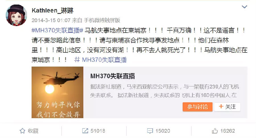 正是这样的一句话,现在看来怎么有一丝奇怪,似乎带有一些威胁的意味——“要小心,只是个善意的提醒。提醒什么呢?如果说她说的毫无根据的话,到底要她小心些什么呢?而据说这位“神预言者”的微博最后在2015年以后就再无更新了,甚至有人猜测马航MH370失联是另有原因,这些种种的猜测都不禁让人感到细思极恐了。