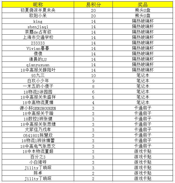 即日起至11月18日,在论坛中举办7个版块联合活动,本次版块联合活动易积分排名前三的同学可获得熊头U盘一只,前十可获得隔热玻璃杯一只更有20份笔记本、卡通扇子、游戏卡贴随机附送礼品多多快来参与吧~!