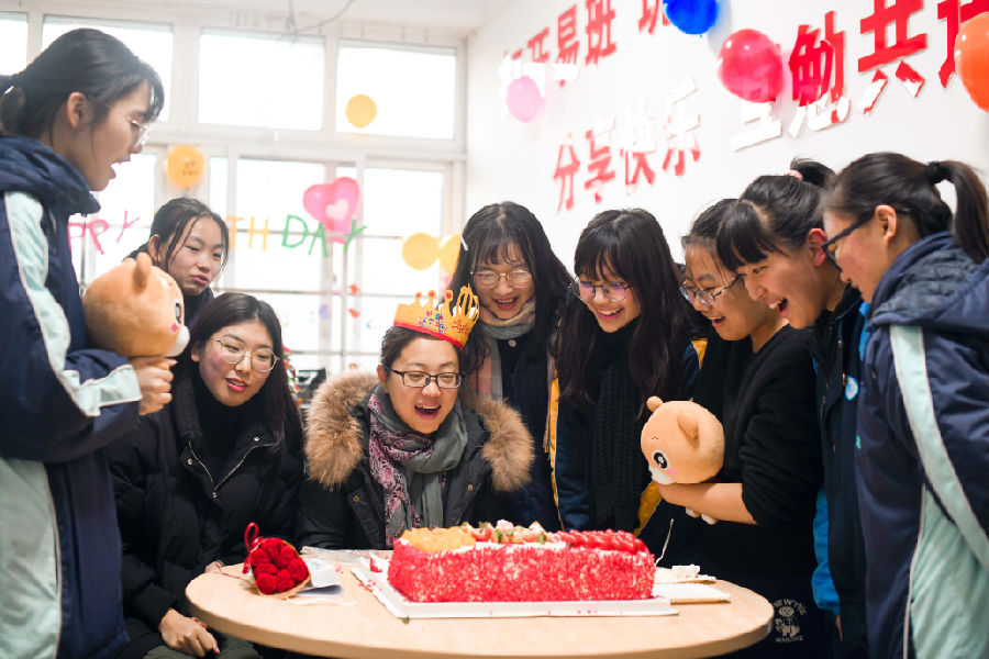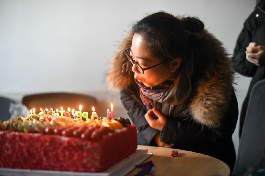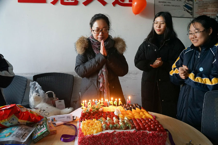 准备已久的惊喜在老师推开工作站站门的一刹那解封,彩炮、音乐、歌声、祝福、花束、礼物。每个人的点滴心意汇聚成暖流,驱散寒流。在众人齐唱的生日快乐歌的歌声里,虞琳老师笑眯了眼睛许下了心愿,一口气吹灭所有蜡烛,在欢笑声和祝福声里,老师拿起刀,为大家切下了带着祝福的第一角蛋糕。