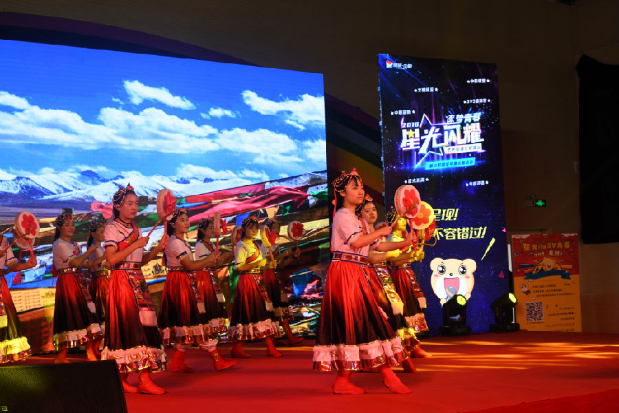 《雪域天鼓》这段舞蹈以女生高歌、击鼓为背景乐,震撼人心,舞姿粗犷豪放而流畅,音乐淳朴明亮,高亢激昂,大开眼界。