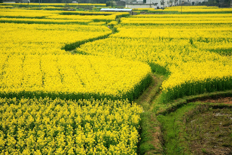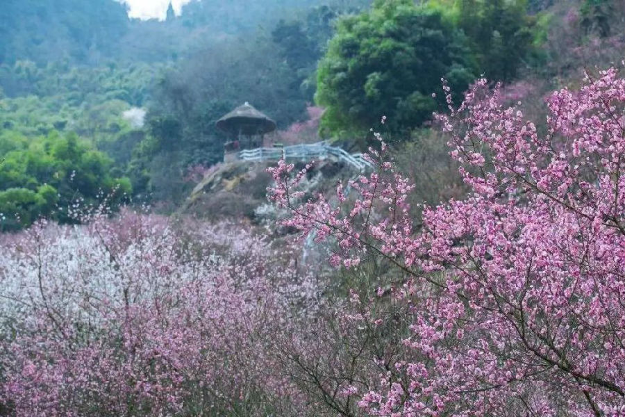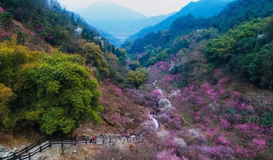 一条小路蜿蜒盘旋,从山顶到山谷下,一路盛开。虽然是梅花,但却有种三生三世十里桃花的错觉。