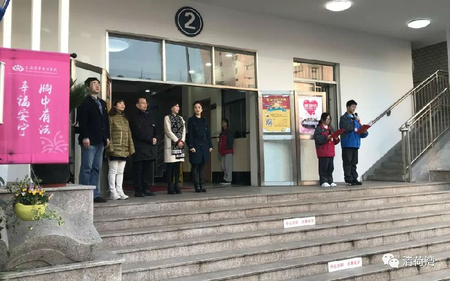 迎着初春的朝阳,来自校仪仗队的四位护旗手高举着鲜艳的五星红旗入场,他们着装整齐、步伐矫健。当雄壮有力的《义勇军进行曲》在清荷园里响起,大家庄严肃穆,行注目礼。