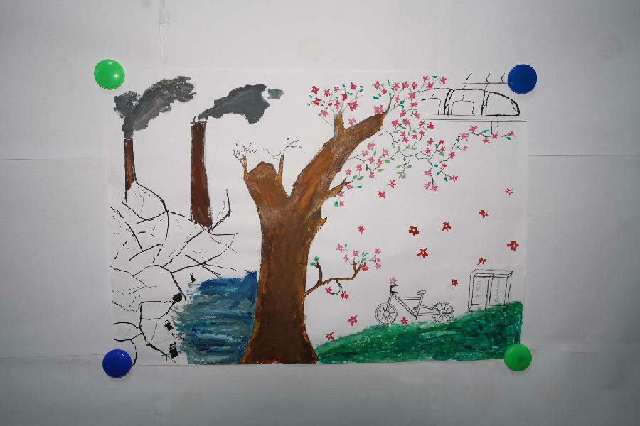 作品介绍:画的中间有一颗大树,树的左边的人们汽车出行,乱扔垃圾,小溪干涸等等,树的右边人们都有行车,步行出行,都很环保,形成对比,反差强烈