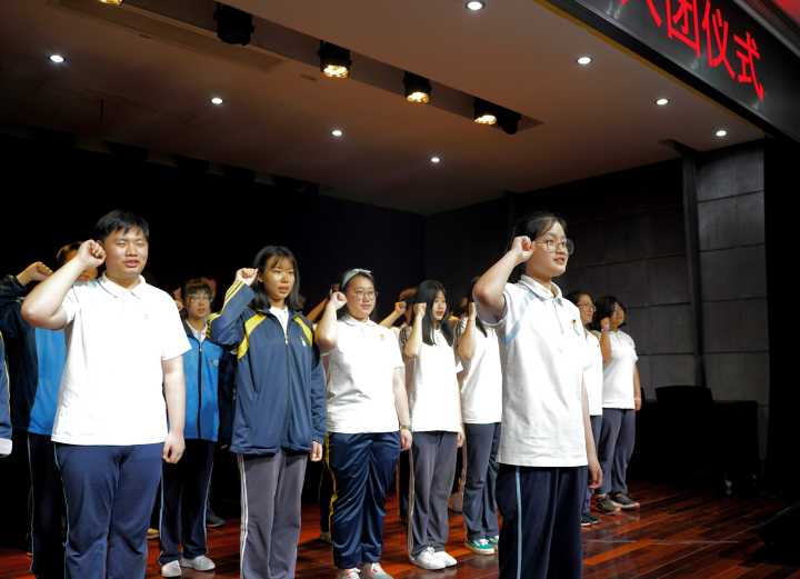 此时,全体师生起立,由主持人宣布新团员名单。团学联代表向新团员颁发团徽,并带领新团员进行宣誓。在面对众多期望的目光里,新团员举起右手庄严宣誓:“我志愿加入中国共产主义青年团,坚决拥护中国共产党的领导……”青春誓言,高亢激昂,表达对于团组织的向往与激情。此时,团歌响起,伴随着奏乐,全场人员齐声唱出了团歌——《光荣啊,中国共青团》。余音缭绕,深入人心。