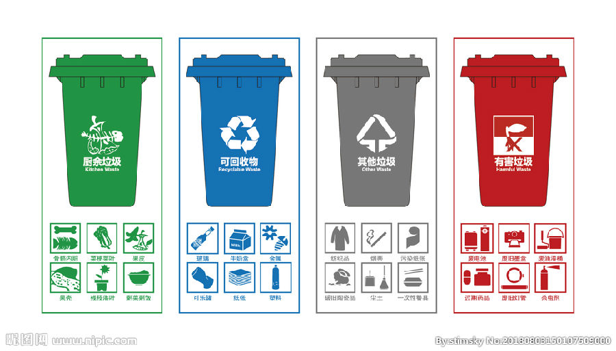 垃圾分类本身是指按一定规定或标准将垃圾分类储存、投放和搬运,从而转变成公共资源的一系列活动的总称。简单来说就是废物利用。进行垃圾分类收集可以减少垃圾处理量和处理设备,降低处理成本,减少土地资源的消耗,具有社会、经济、生态三方面的效益。现在最普遍的四种垃圾分类箱分别是干垃圾、湿垃圾、有害垃圾、可回收垃圾。