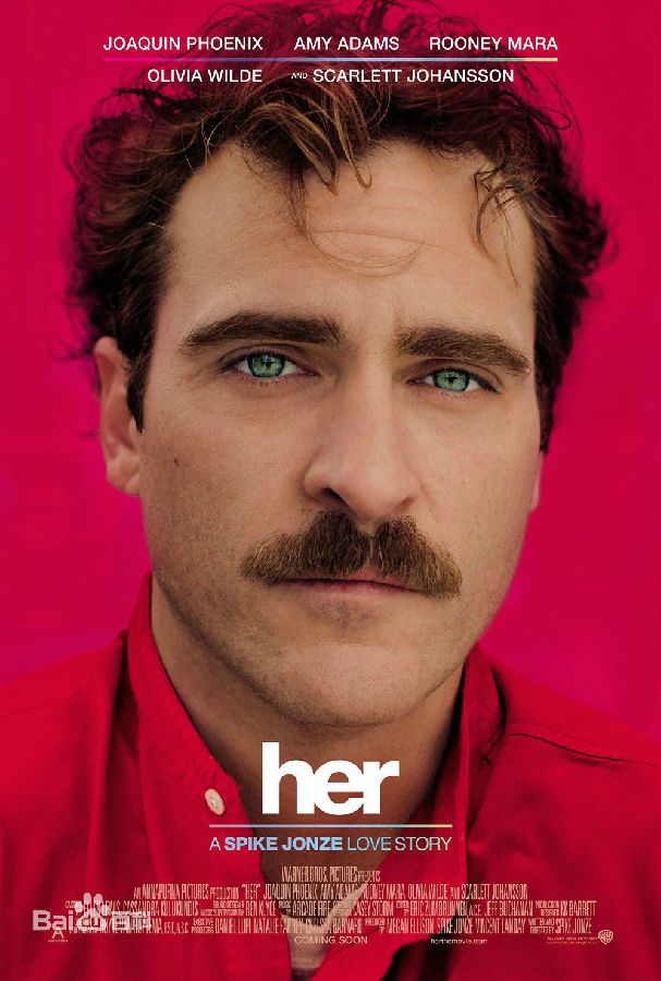《她》(Her)是斯派克·琼斯编剧并执导的一部科幻爱情片,由华金·菲尼克斯、斯嘉丽·约翰逊(配音)、艾米·亚当斯主演,于2013年12月18日在美国上映。《她》讲述了作家西奥多在结束了一段令他心碎的爱情长跑之后,他爱上了电脑操作系统里的女声,这个叫“萨曼莎”的姑娘不仅有着一把略微沙哑的性感嗓音,并且风趣幽默、善解人意,让孤独的男主泥足深陷。该片获得2014年第86届奥斯卡最佳原创剧本奖。
