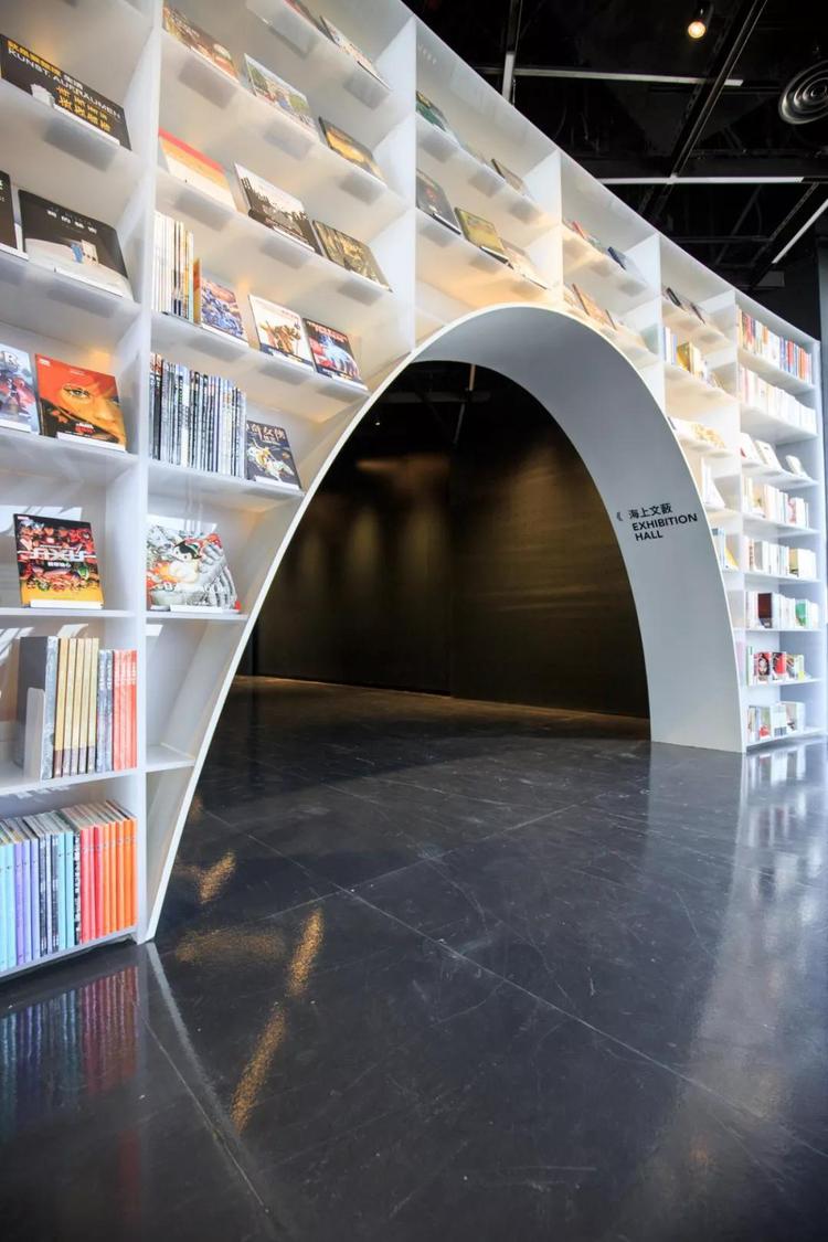 云端上的山水•秘境 走在“山水”中连绵不绝的门洞仿佛穿越一个个曲折幽秘的山洞,穿梭在书本堆积而成的山中,半透明的书架设计仿佛漂浮在山中的云朵。