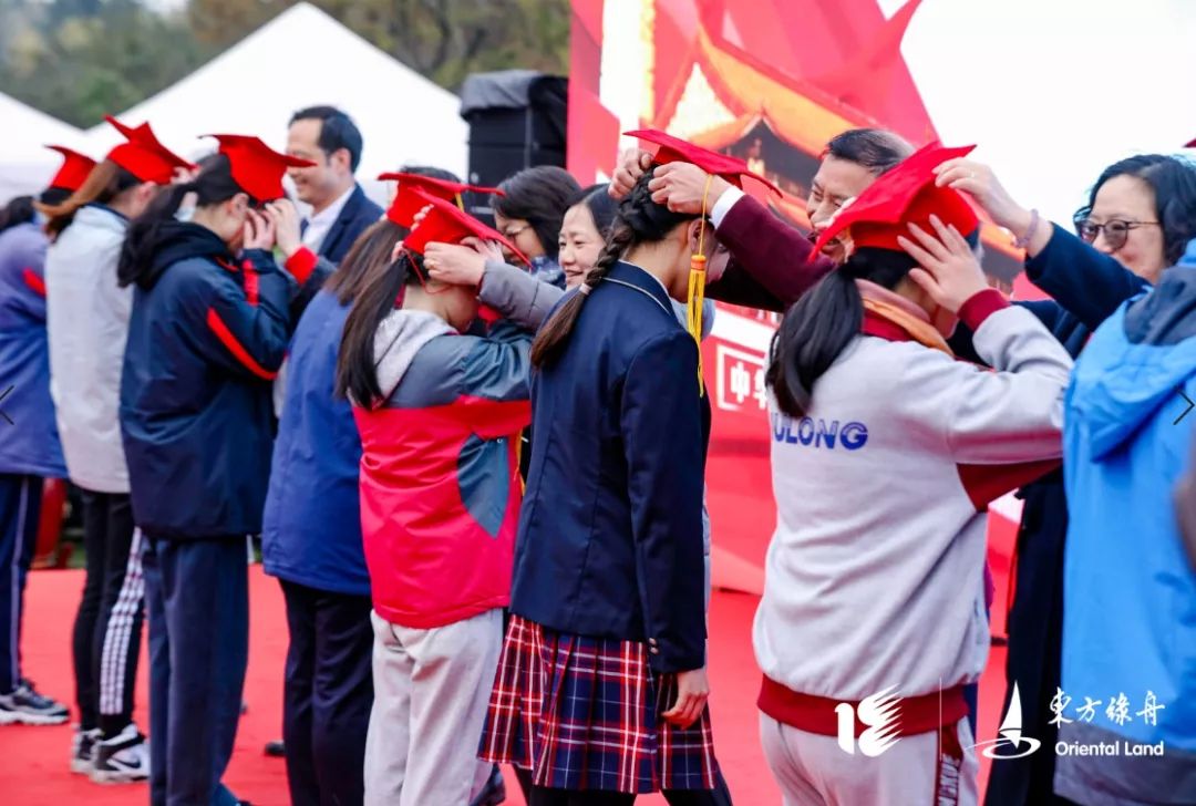在曾服役于中国人民解放军仪仗大队赵鑫教官和郑明教官的带领下,学生头戴成人帽宣读誓言,表明履行权利,承担义务,传承文化的决心和斗志。
