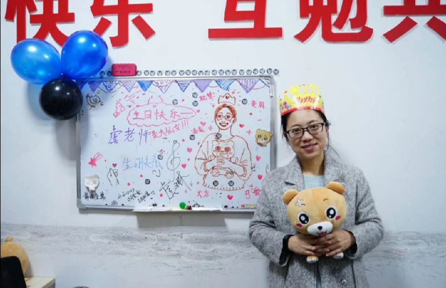 易班工作站的站内成员在12月11日为虞老师秘密准备了此次生日派对。在11.10日,站内成员花了一个晚上布置工作站,将气球以爱心的形式贴在窗帘上,将两个桌子拼在一起,在桌上摆了薯片,水果,瓜子以及蛋糕。工作站的每一处地方,每一位站内成员都精心准备过。派对当天前任站长萧达飞,副站长戚莺音,记者部部长张鑫悦等学长学姐都专门从版专学校赶到新闻学校为虞老师准备一个惊喜。