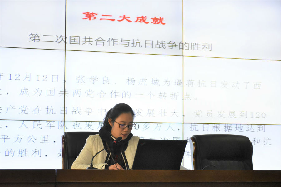 张老师就中国共产党的成立、三个历史时期、五大成就、四次挫败和基本经验五个方面来叙述党的历史事迹来为学员们进行介绍。学员们深刻地了解到党的光荣而艰辛的奋斗历程以及留给我们后带人的经验。