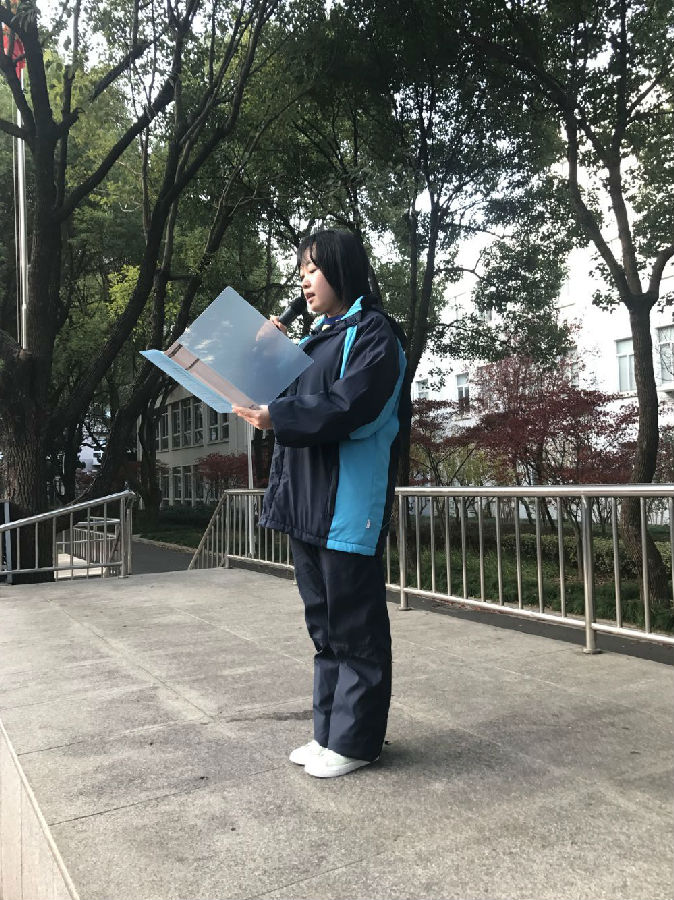 尊敬的各位老师,亲爱的同学们,大家早上好!我是17级邮轮一班的管玥莹,很荣幸今天的升旗仪式由我来主持。