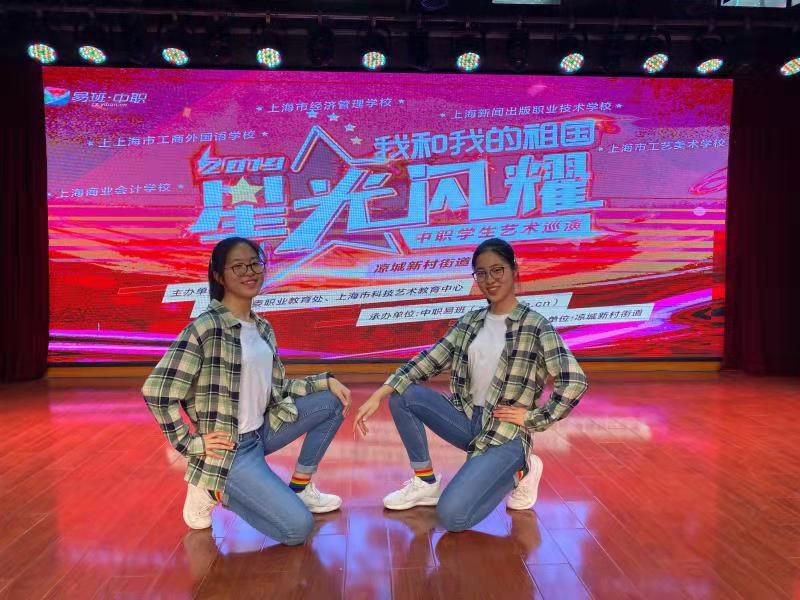 活动开场,首先回顾了2019年各中职校在上海各个街道举行的星光巡演的盛况。在这一年的活动中,涌现出了一批“闪耀之星”。其中由我校推选,罗茜和罗昕两位同学演绎了优秀节目双人爵士舞《Mr.Mr》,她们青春活泼的舞姿赢得了现场观摩师生的热烈掌声。
