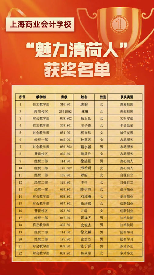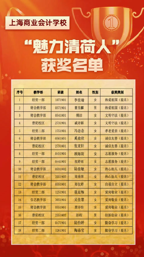 再次祝贺以上获奖的同学,也祝愿每一位奋斗在追梦路上的清荷学子有付出、有收获。希望各位获得“魅力清荷人”称号的同学发挥榜样的力量,帮助身边更多的同学在清荷园的学习生活中留下最美好的青春年华。