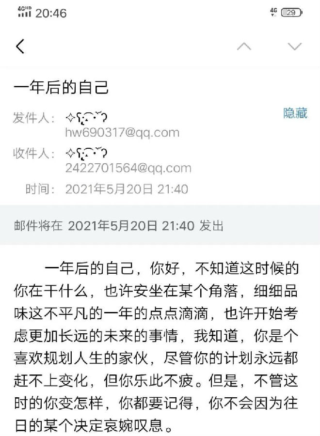 活动设计需要同学们仔细思考:新的一年有哪些目标?想为此付出哪些努力?给一年后的自己说些什么?把这些想法写下来,以邮件的形式,定时发给一年后的自己。当明年五月收到自己一年前的邮件时,看一看:你的目标实现了吗?有什么想对自己说的吗?