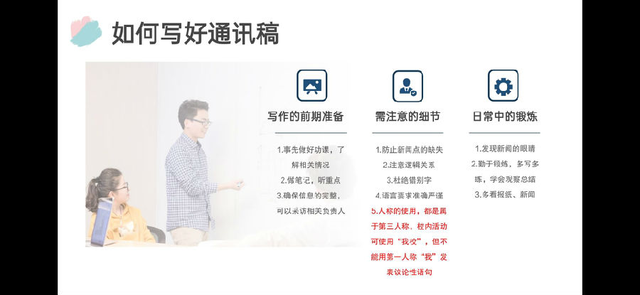 对于需要自己动手写稿的小记者们来说,新闻通讯稿是一种实用性较高的文章题材。为了帮助新生部员更好地了解通讯稿的基本概念与写作方法,本学期第一次记者部新成员培训中,部长曹心璐同学为我部的新成员们开展了第一堂课,"如何写好通讯稿"。