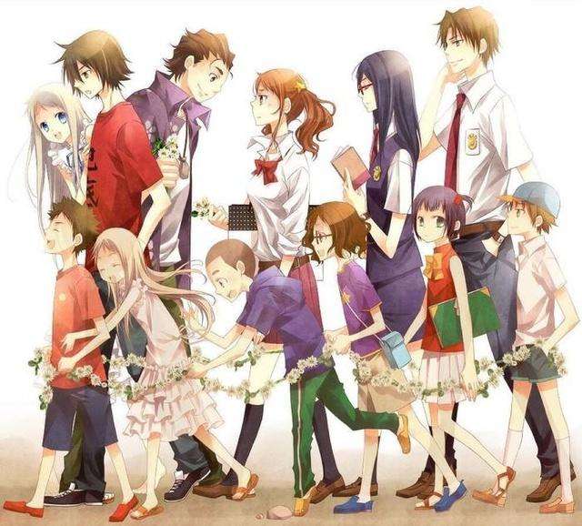 《未闻花名》:讲述的是从小时候起一直青梅竹马的6人,却在升上高中之后彼此有了距离。不太与人们接触的主角宿海仁太、有点被小太妹熏染的安城鸣子、进入重点高中的松雪集与鹤见知利子、放弃读高中而展开旅行的久川铁道、只有幼年死去的本间芽衣子(灵魂,只有仁太能看见)还是一如从前。