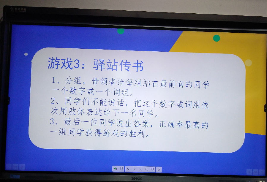 活动的内容分为四个板块,猜拳接龙,报团取暖,驿站传书和闭眼作画,这些都是以做游戏的方式,来带动同学们的积极性,互动性。每一个板块都需要每位同学去参与,老师会清楚的讲解规则。同学们也都融入在游戏的世界里,露出快乐的笑容并且大家一起讨论和思考。