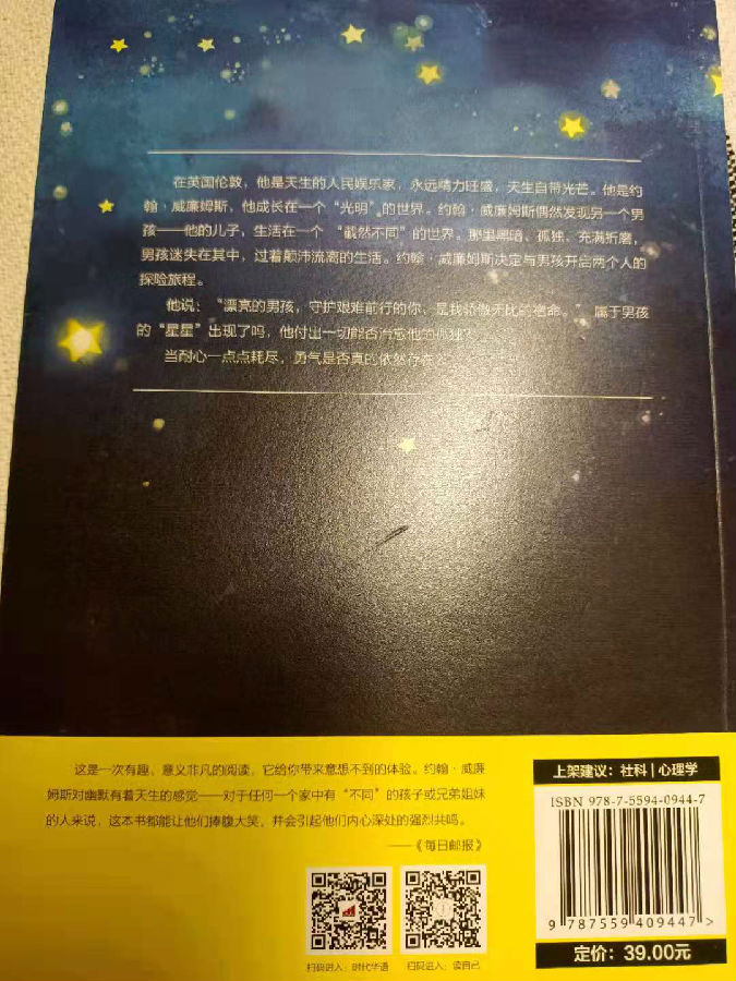 今天想给大家推荐一个真实而伟大的心理故事《摘星星的男孩》,由英国心理疗愈小说家约翰威廉·姆斯创作。这书原著叫做《我的儿子不是雨人》因为作者和一位自闭症儿童的故事,而自闭症的孩子活在自己的世界里,  “就像拥有一套不属于地球人的思维方式,无法正常与人沟通,就好似天上的星星,一人一世界,独自闪烁。”所以叫做《摘星星的男孩》。