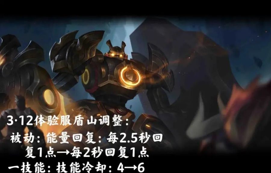 盾山本次改动官方增加了两秒一技能CD和能量回复;我认为这些改动对盾山在对局中影响不大影响,盾山比较强势的点还是在二技能开团能力和大招的分割战场能力。
