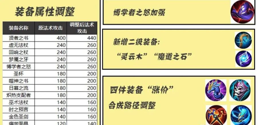 兵线调整:小兵血量调低、增加一个近战小兵来增加中路收入经济收入。法术装备法术攻击提升,降低博学者之怒的法术百分比加成、新增法术二级装备《灵云木》和《魔道之石》,灵云木的法术穿透弥补了小面具改版后取消的属性。